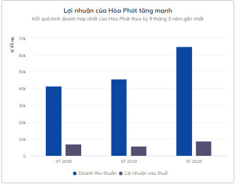 Lũy kế 9 tháng, Hòa Phát đạt doanh thu 65.000 tỷ đồng và lãi ròng 8.845 tỷ đồng. So với cùng kỳ năm trước, hai chỉ tiêu doanh thu, lợi nhuận lần lượt tăng 40% và 56% và cao hơn kết quả của cả năm 2019.