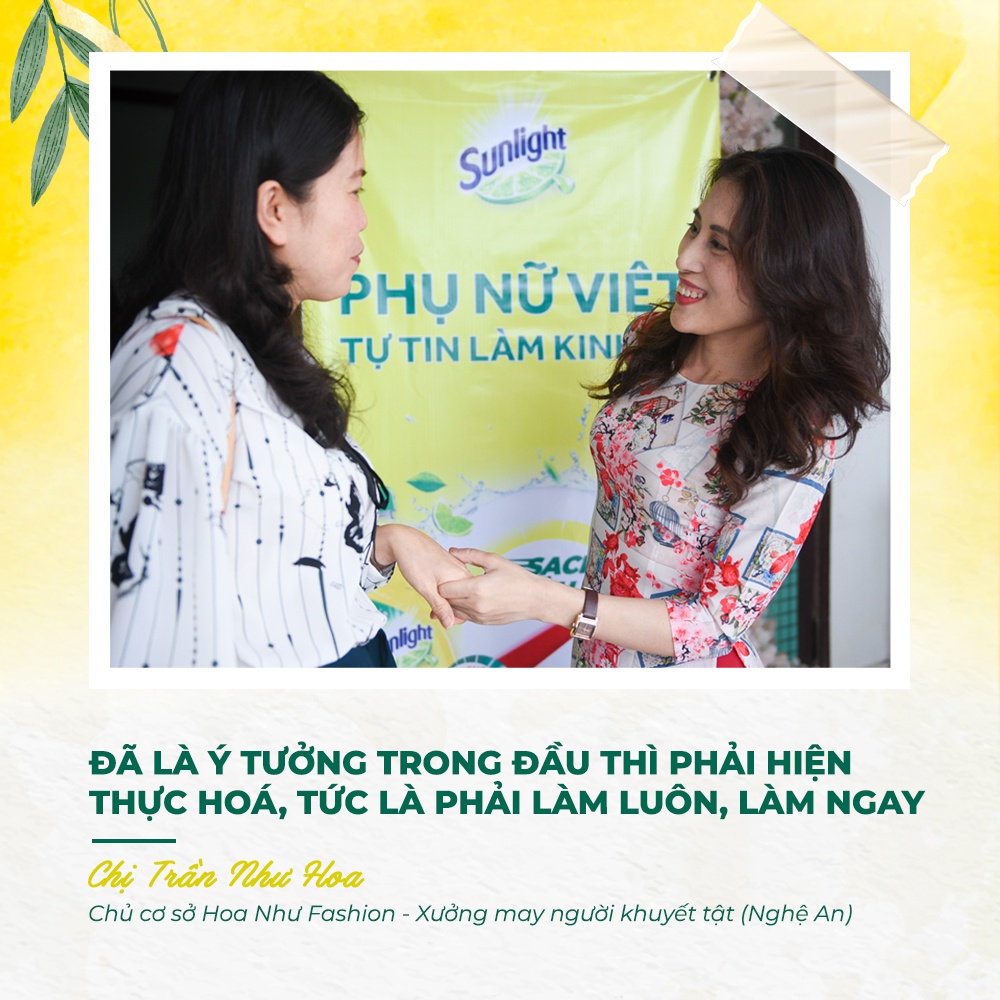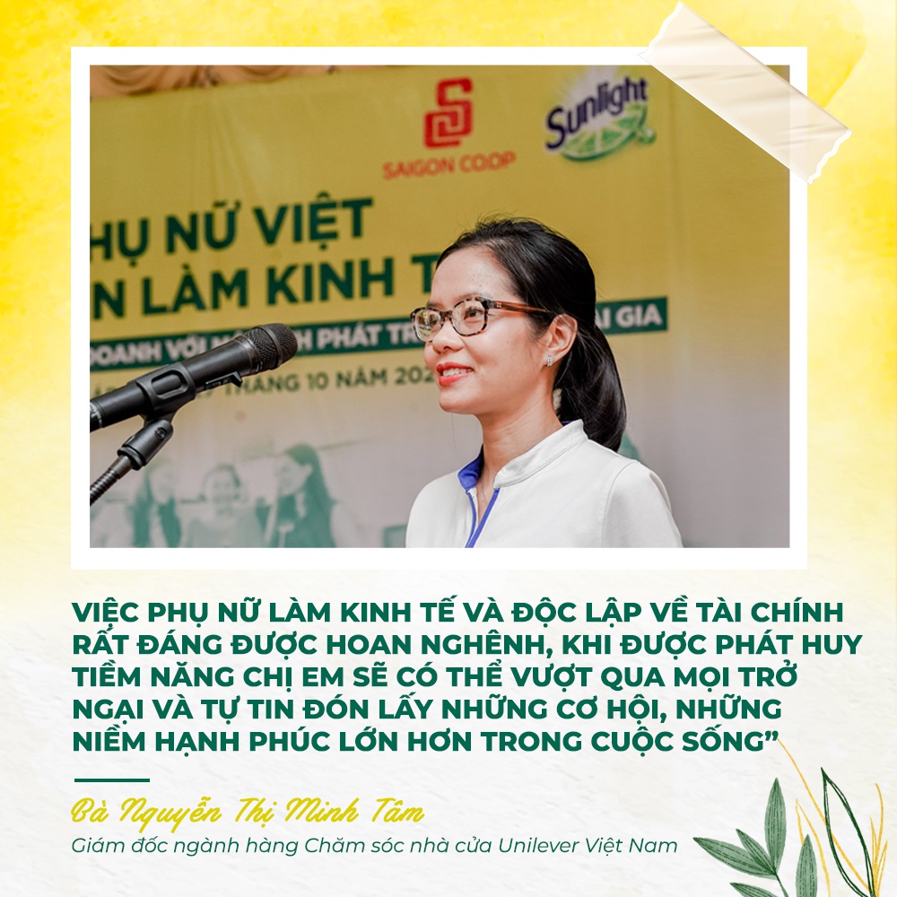 Giải phóng tiềm năng và đồng hành cùng sự phát triển của phụ nữ là một trong những sứ mệnh của Sunlight, Unilever ngay từ ngày đầu thành lập. Thương hiệu này tin rằng mỗi phụ nữ Việt đều ẩn chứa tiềm năng riêng và vị trí của người phụ nữ không chỉ dừng lại ở căn bếp mà họ có thể đóng góp nhiều hơn cho gia đình và xã hội. Đó cũng lý do Sunlight đồng hành cùng Hội Liên hiệp Phụ nữ Việt Nam mang chương trình “Phụ nữ Việt tự tin làm kinh tế” nhằm truyền cảm hứng và hỗ trợ vốn cho 1.000 dự án phụ nữ khởi sự kinh tế tại 10 tỉnh thành trên khắp dải đất hình chữ S.