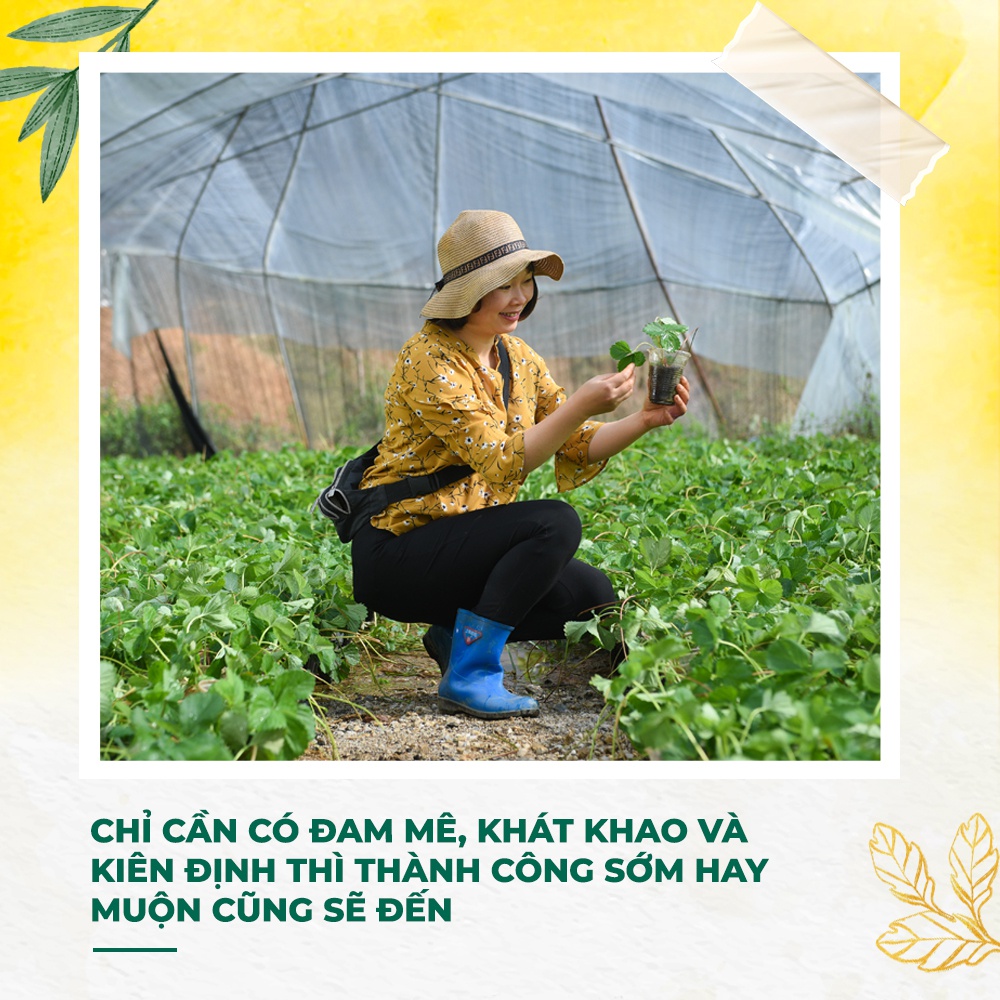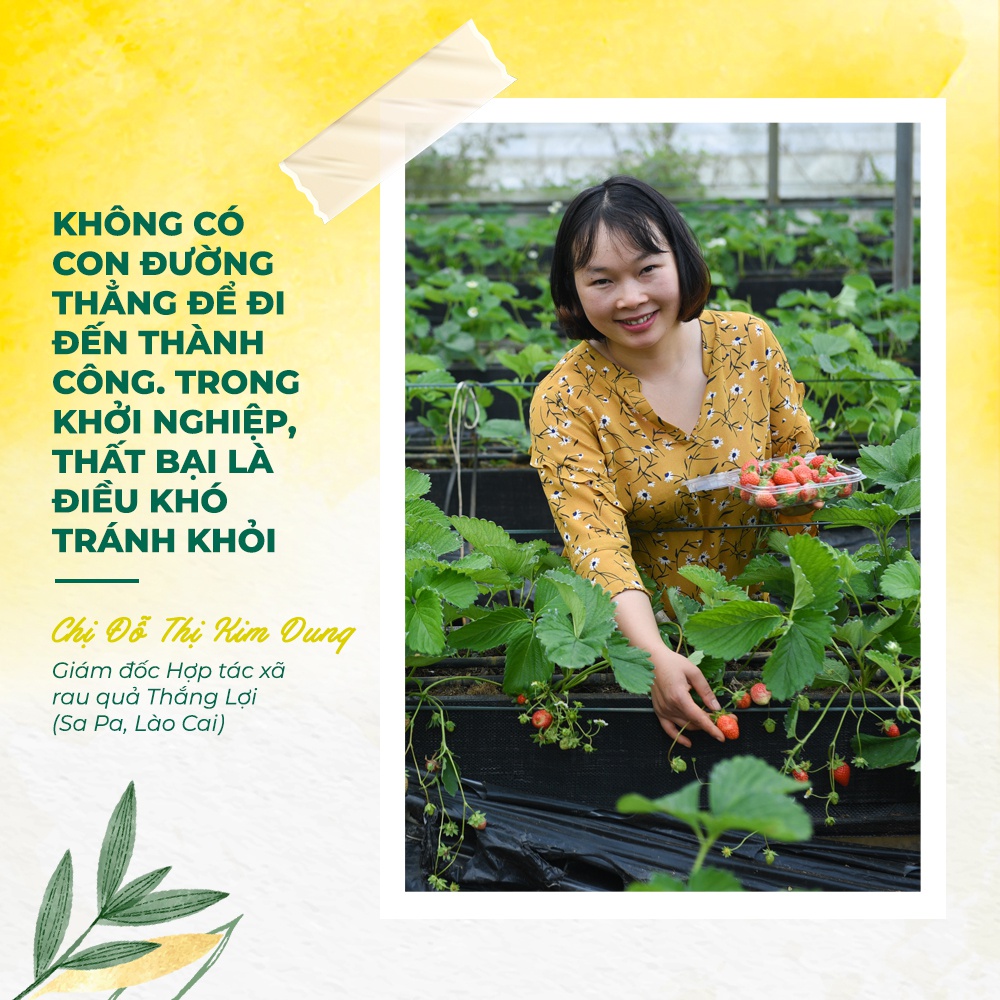 Ấp ủ làm trang trại dâu tây từ tuổi đôi mươi, chị Dung dành toàn bộ những gì mình có để biến ước mơ thành hiện thực. Song, hai mùa vụ thất bại, chị mất trắng… Tất cả không làm người phụ nữ 23 tuổi chùn bước. Từ shipper đến bán hàng online, việc gì chị cũng làm với mong muốn tích lũy để tiếp tục giấc mơ đang dang dở. Đáp lại niềm đam mê cháy bỏng và lòng kiên trì ấy, Hợp tác xã rau quả Thắng Lợi ra đời, ngày càng được nhiều người biết đến và trở thành một trong 2 dự án do nhãn hàng Sunlight (Unilever Việt Nam) đồng hành, tài trợ đoạt giải Ứng dụng công nghệ nhằm thích ứng, bảo vệ môi trường tại cuộc thi “Phụ nữ khởi nghiệp năm 2020”.